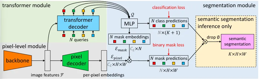 훈련 과정에서는 보통 GT 이미지에 K개의 object mask(K < N) 가 존재한다. 모델은 총 N개의 query를 출력하므로, Hungarian matching을 사용해 N개의 query와 K개의 GT object를 매칭한다. 매칭되지 않은 N-K개의 query는 class loss만(no-object로) 적용되고, 매칭된 query들은 class loss + mask loss를 모두 받게 된다.