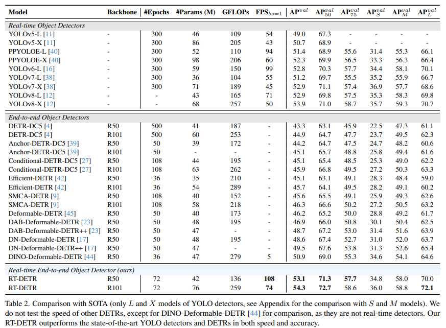 위의 표를 보면 RT-DETR이 speed와 accuracy모두 다른 모델들에 비해 우수한 것을 알 수 있다.