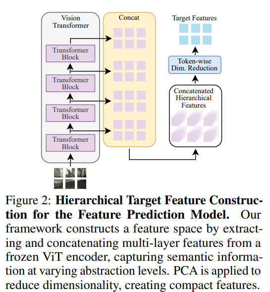 이에 따라 본 논문에서는 VFM의 여러 layer에서 모든 visual patch의 embedding을 추출한 뒤, 서로 다른 layer에서 동일한 spatial 위치에 해당하는 patch embedding들을 channel-wise로 concatenation하여 각 위치마다 하나의 고차원 embedding을 구성한다. 이후 이러한 embedding은 차원이 지나치게 커지는 문제를 가지므로, PCA를 적용하여 차원을 축소하고, 이를 통해 각 visual patch에 대해 최종적인 DINO feature representation을 생성한다.