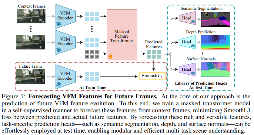 그러나 미래 frame 예측이라는 task의 궁극적인 목적을 다시 생각해보면, 우리가 진정으로 원하는 것은 미래 frame의 RGB 자체라기보다는, 그로부터 얻을 수 있는 semantic segmentation, object detection과 같은 downstream task에 필요한 정보라고 볼 수 있다. 실제로 이러한 downstream task의 입력을 살펴보면, 형식적으로는 RGB 이미지일 수 있지만, 모델 내부에서는 결국 DINO와 같은 Vision Foundation Model(VFM)의 feature를 사용하게 된다.