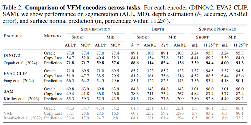 이러한 설정을 통해, 제안한 모델이 예측한 미래 DINO feature를 사용할 때의 downstream task 성능이 lower bound와 oracle 사이에서 어느 위치에 놓이는지, 즉 모델이 oracle 성능에 얼마나 근접하는지를 정량적으로 평가한다.