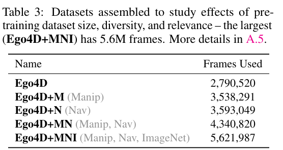 가장 기본이 되는 데이터셋은 Ego4D로, 일상적인 1인칭 시점에서 촬영된 비디오 데이터로 구성되어 있으며, manipulation과 관련된 장면이 비교적 많이 포함되어 있다. Ego4D+M은 Ego4D에 manipulation 중심의 데이터를 추가한 구성이고, Ego4D+N은 Ego4D에 navigation 관련 데이터를 추가한 것이다. Ego4D+MN은 manipulation과 navigation 데이터를 모두 포함한 버전이며, 마지막으로 Ego4D+MNI는 Ego4D+MN에 ImageNet을 추가하여 시각적 다양성을 극대화한 데이터셋이다.