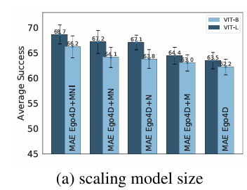 다음으로 데이터셋 다양성이 미치는 영향을 보면, pretraining에 사용되는 데이터의 diversity가 증가할수록 downstream task들의 전반적인 성능이 크게 향상되는 경향이 나타난다. 다만 Ego4D 자체에 이미 manipulation 관련 장면이 상당수 포함되어 있기 때문에, Ego4D+N에서 Ego4D+MN으로 확장했을 때의 성능 증가는 비교적 미미한 편이다.