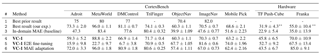 논문에서는 앞서 소개한 Ego4D + MNI 데이터셋을 사용해 MAE objective로 사전학습한 모델을 VC-1이라고 정의한다. VC-1의 다운스트림 성능을 기존의 여러 vision encoder들과 linear probing 방식으로 비교한 결과, CortexBench 전반에서 SOTA 성능을 달성했음을 확인할 수 있다.