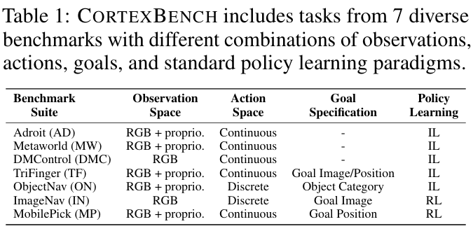 CortexBench는 Embodied AI 커뮤니티에서 중요하게 여겨지는 17개의 로보틱스 다운스트림 태스크를 선별하여 구성한 벤치마크이다. 이 태스크들은 총 7개의 널리 사용되는 기존 벤치마크에서 가져온 것으로, 다양한 로보틱스 시나리오를 포괄하도록 설계되었다. 구성된 태스크들은 복잡한 manipulation 문제부터 locomotion, navigation에 이르기까지 폭넓은 범위를 포함하며, 사전학습된 vision encoder의 성능을 다양한 조건에서 공정하게 평가할 수 있도록 한다.
