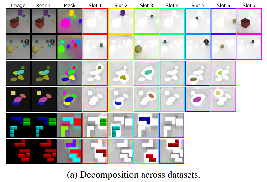 이후 각 slot을 decoder에 통과시켜서 각각 하나의 이미지 component를 생성하고,
