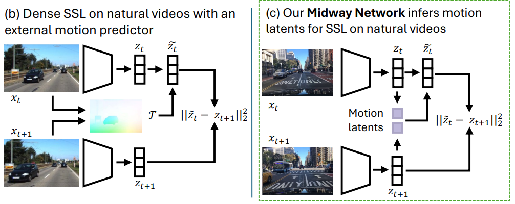 (b)와 같은 접근의 한계는 latent 공간이 훨씬 더 풍부한 구조를 가질 수 있음에도 불구하고, 표현이 optical flow라는 특정한 형태의 변화에 강하게 맞춰질 가능성이 있기 때문이다. 그 결과, optical flow와 잘 부합하지 않는 downstream task에서는 반드시 최적이라고 보장하기 어렵다.