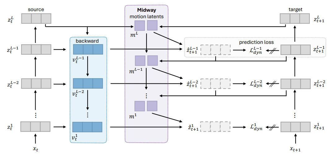 Midway는 여기에 multi-level refinement라는 구조를 추가한다. 모션 정보는 한 번 사용되고 끝나는 것이 아니라, 상위 레벨에서 만들어진 뒤 아래 레벨로 내려가면서 계속해서 수정되고 보완된다. 이 과정에서 모델은 단일 레벨의 예측만 맞추는 것이 아니라, 여러 해상도와 추상화 수준에서 동시에 일관된(invariant한) 변화를 설명해야 한다. 만약 motion이 특정 level에서만 통하는 임시적인 값이라면, 아래 단계로 내려갈수록 금방 모순이 발생하고 예측이 틀어질 것이다. 결국 살아남는 motion은 여러 단계에 걸쳐 공통적으로 적용될 수 있는 변화 방향일 수밖에 없다.